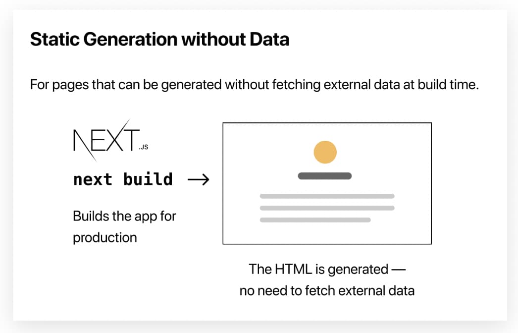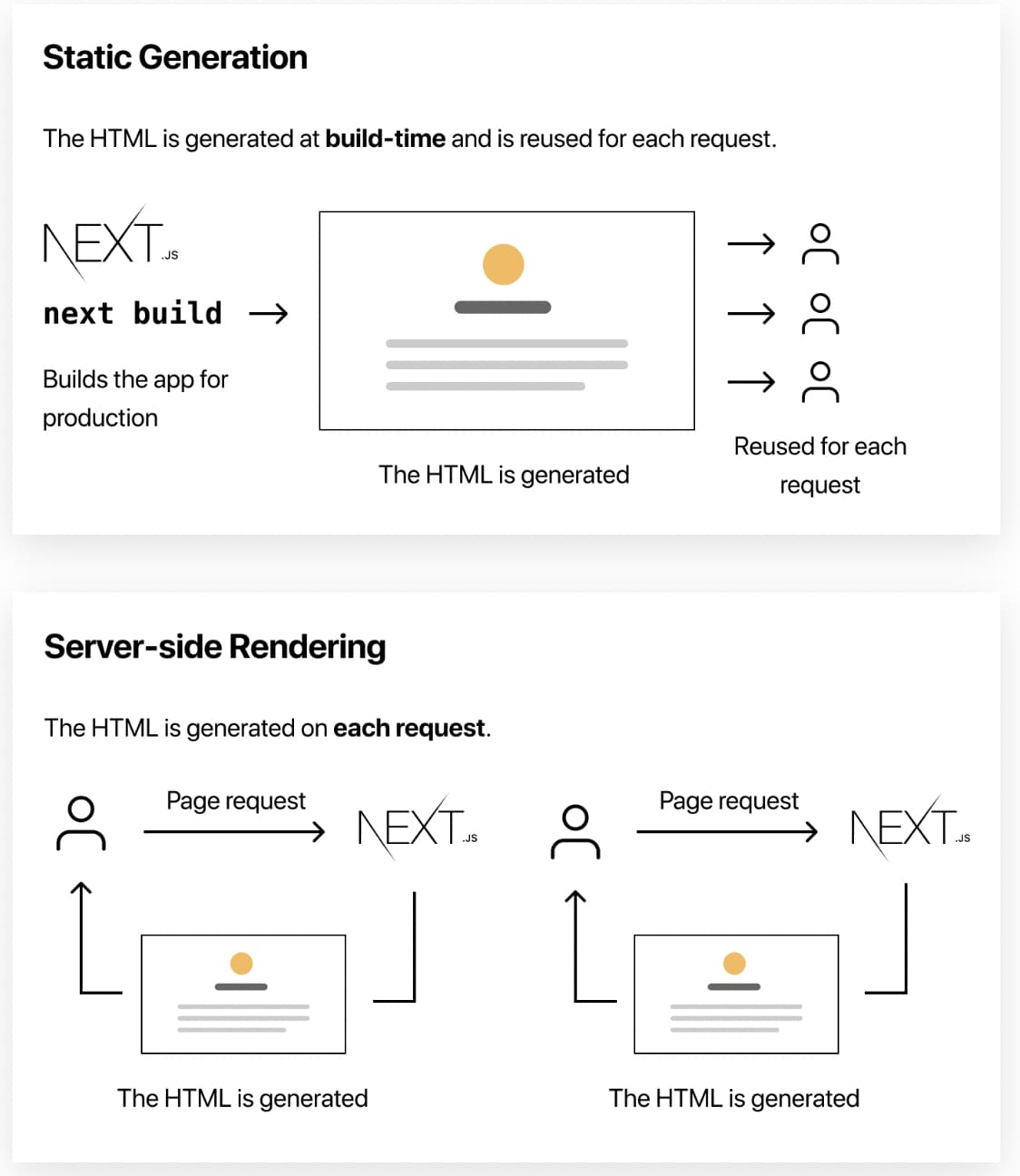 Static Generation - HTML은 빌드 시 생성되며 사용자 요청에 따라 재사용된다.