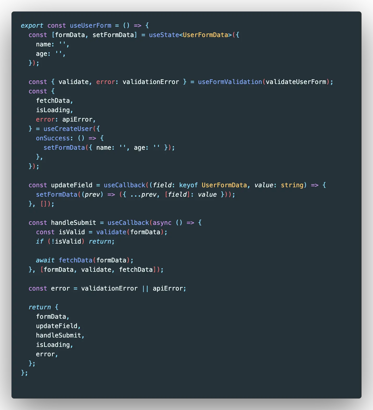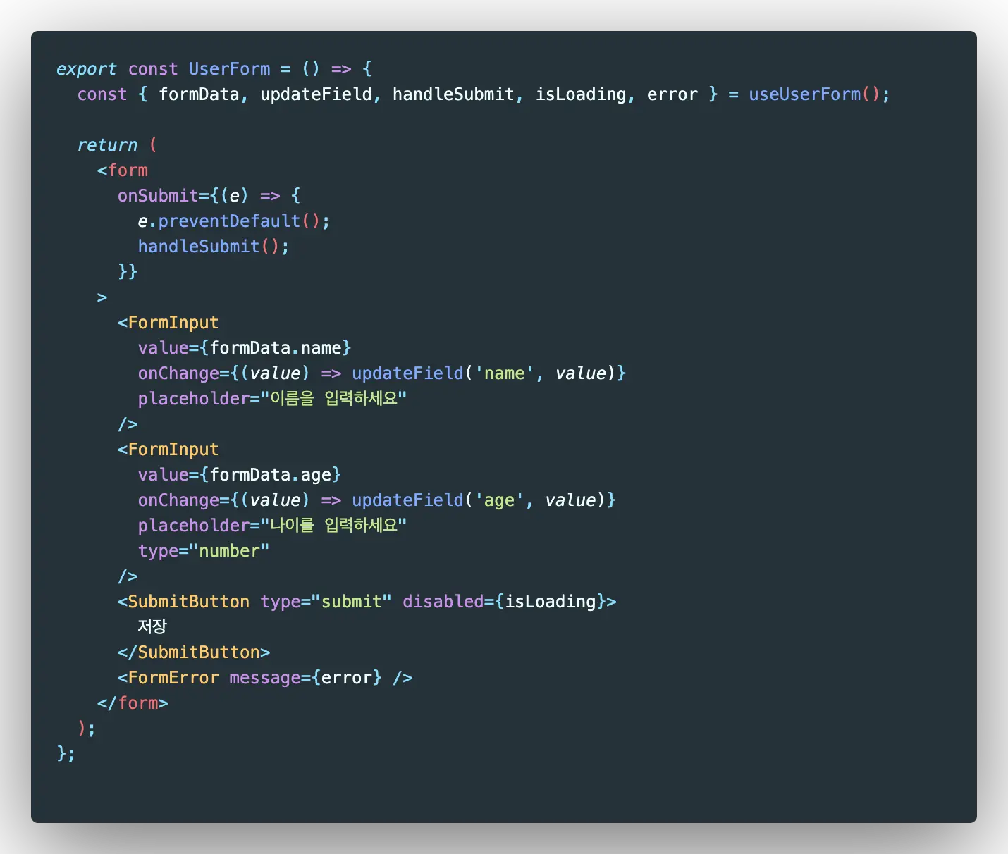 useUserForm : Form 상태와 두 로직을 조합하는 역할만 수행
