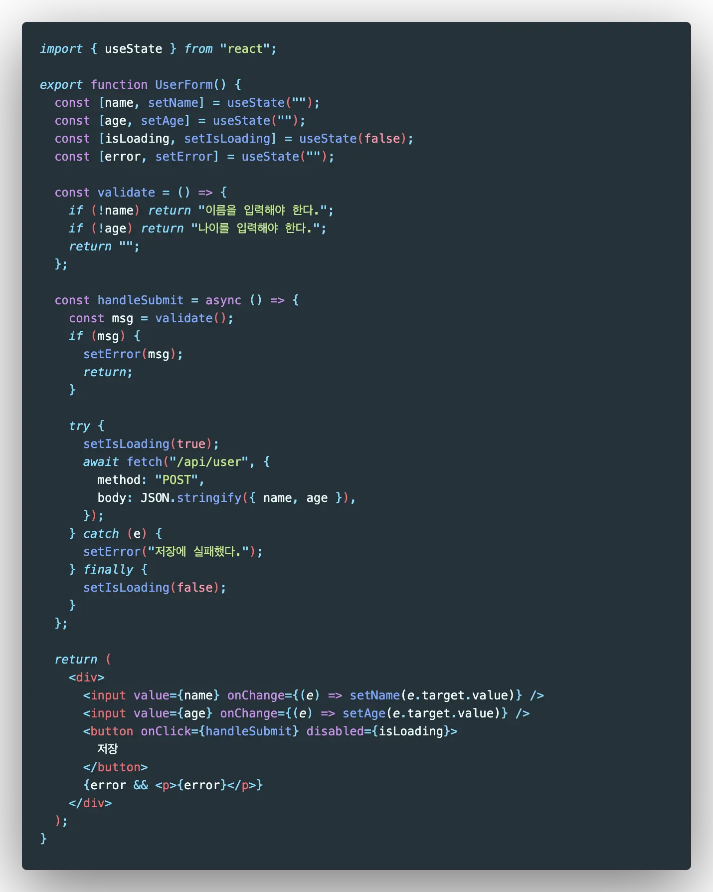 하나의 컴포넌트가 여러 역할을 처리한다 는 의미이다. UI, 검증, 데이터 가공, 네트워크 요청이 섞여 있을 가능성이 매우 높다.
